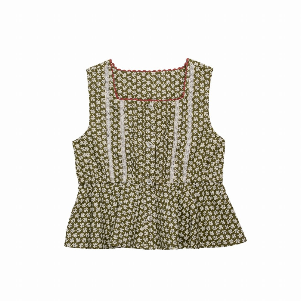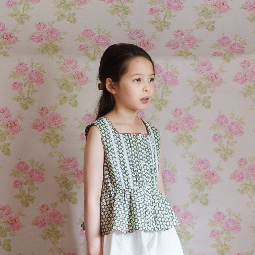 A beautiful sun-top made in our organic Pembroke floral fabric. Perfect for a special party or dressed down for a day on the beach. Buttons run all down the front with cotton lace trim and pin tucks either side. The neck is square cut with contrasting ric rac trim around the edge. The waist has soft elastic in it and frill is gathered and cut on the bias.