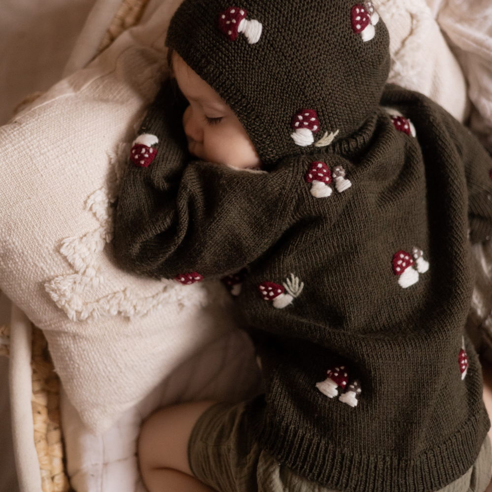 This collection is carefully handcrafted from soft merino wool by skilled artisans. Colorful embroidery inspired by the woodland universe adds a gentle touch of magic to the timeless design. Gender-neutral, warm, soft, and meticulously made, this piece is truly special.