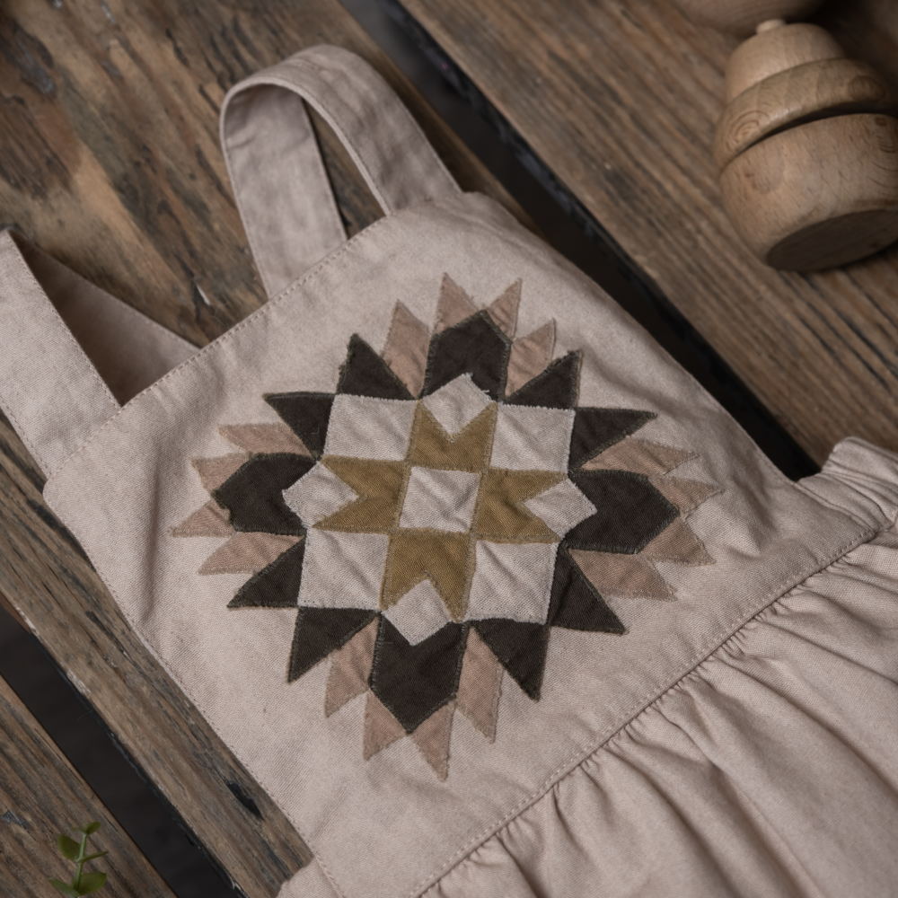 A charming romper that combines simplicity with artistry. The striking patchwork design draws the eye, and the earthy-toned motifs create a rustic, handcrafted feel.