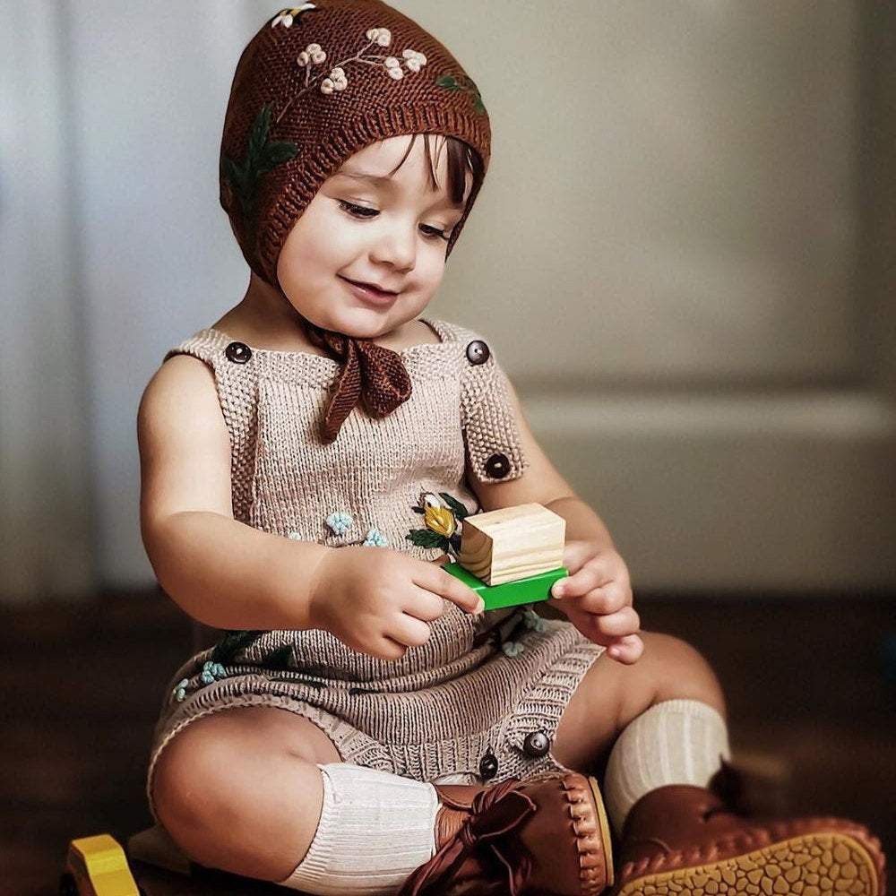 A charming bonnet made from soft organic cotton, carefully hand-knitted and hand-embroidered for a delightful finish.