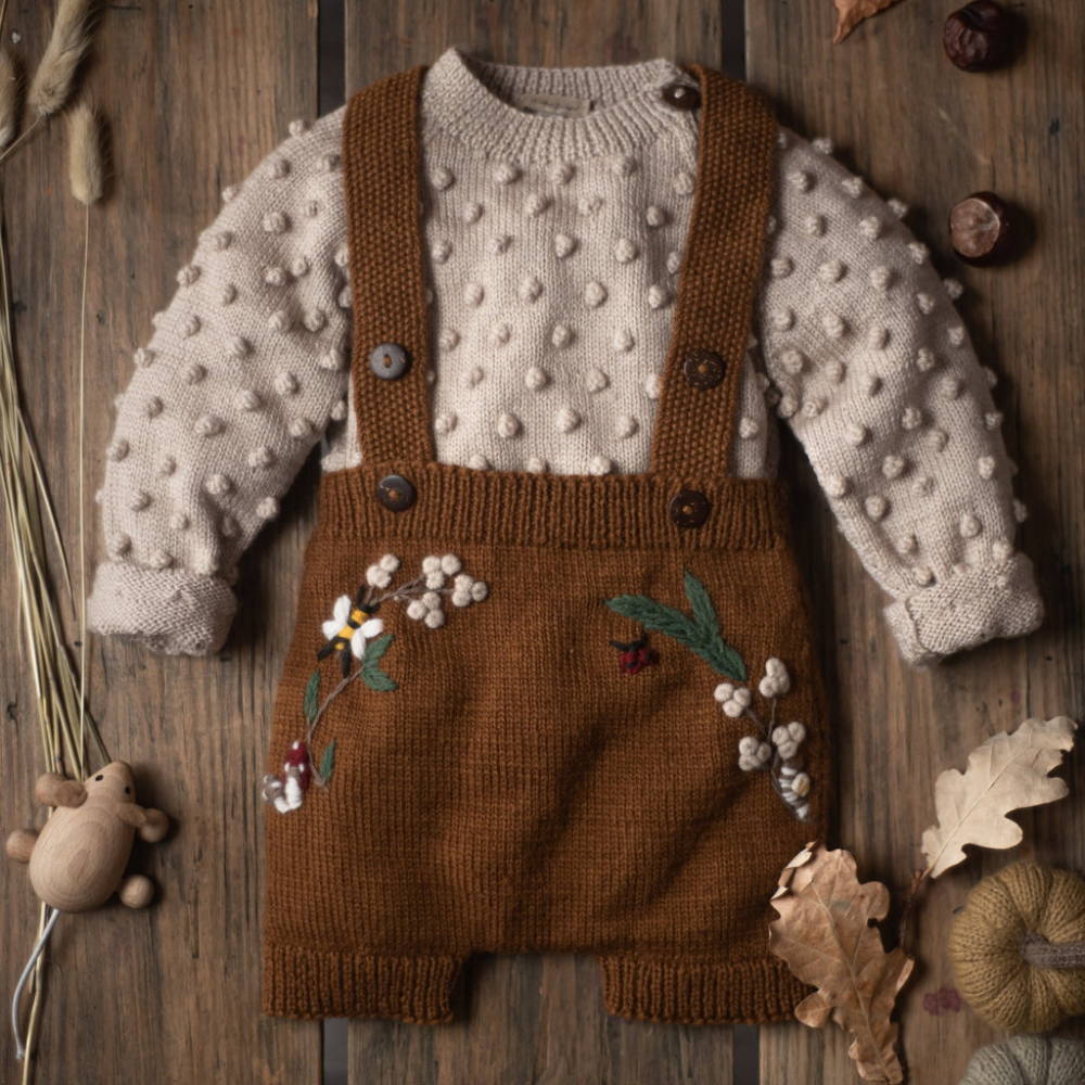 Each piece is carefully hand-knitted from soft merino wool by skilled artisans. Hand-embroidered motifs inspired by the woodland world, including little bees, ladybugs, forest berries, and mushrooms, add whimsical charm. Extremely comfortable to wear and beautifully crafted, this is a truly special piece.